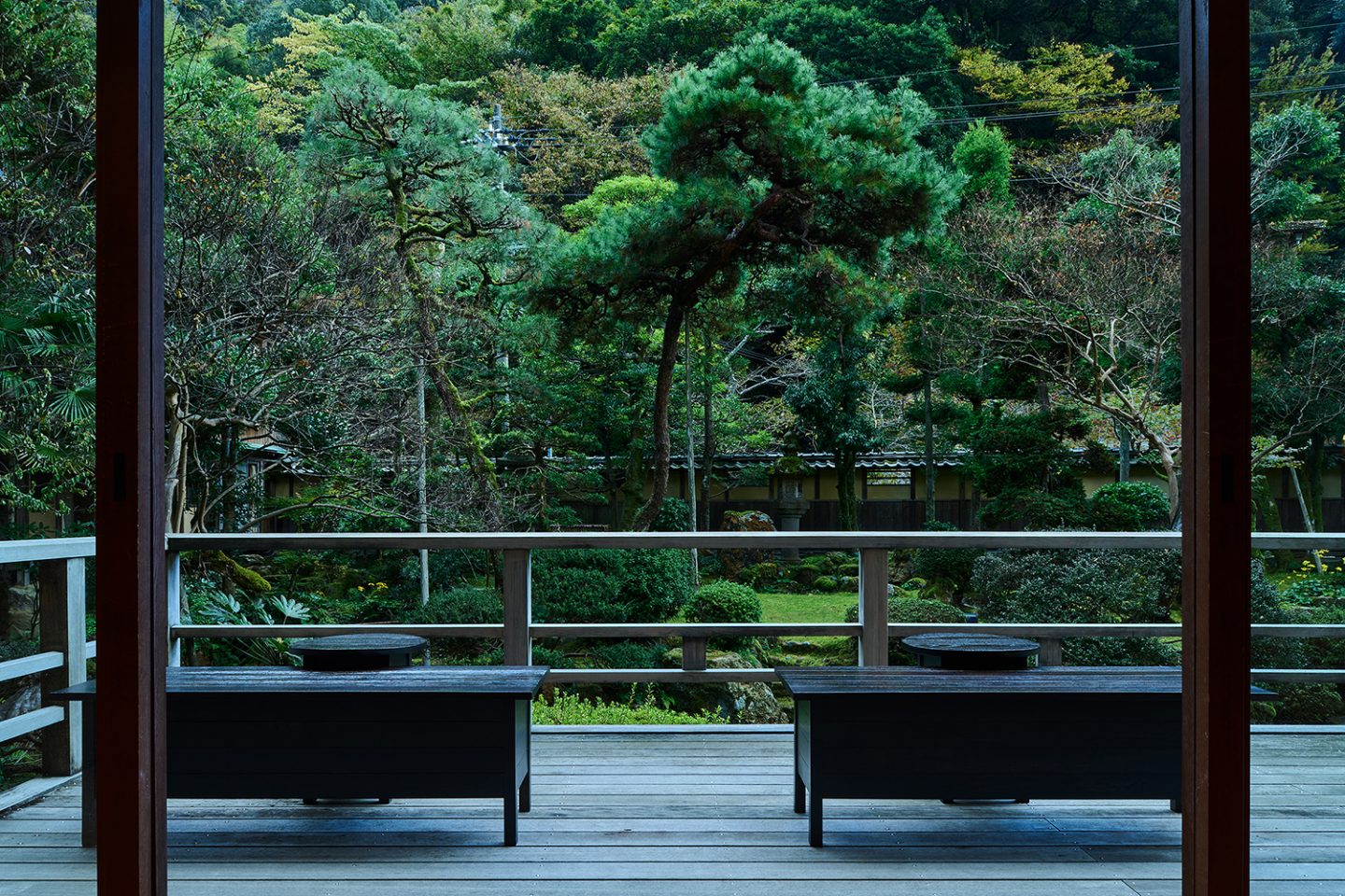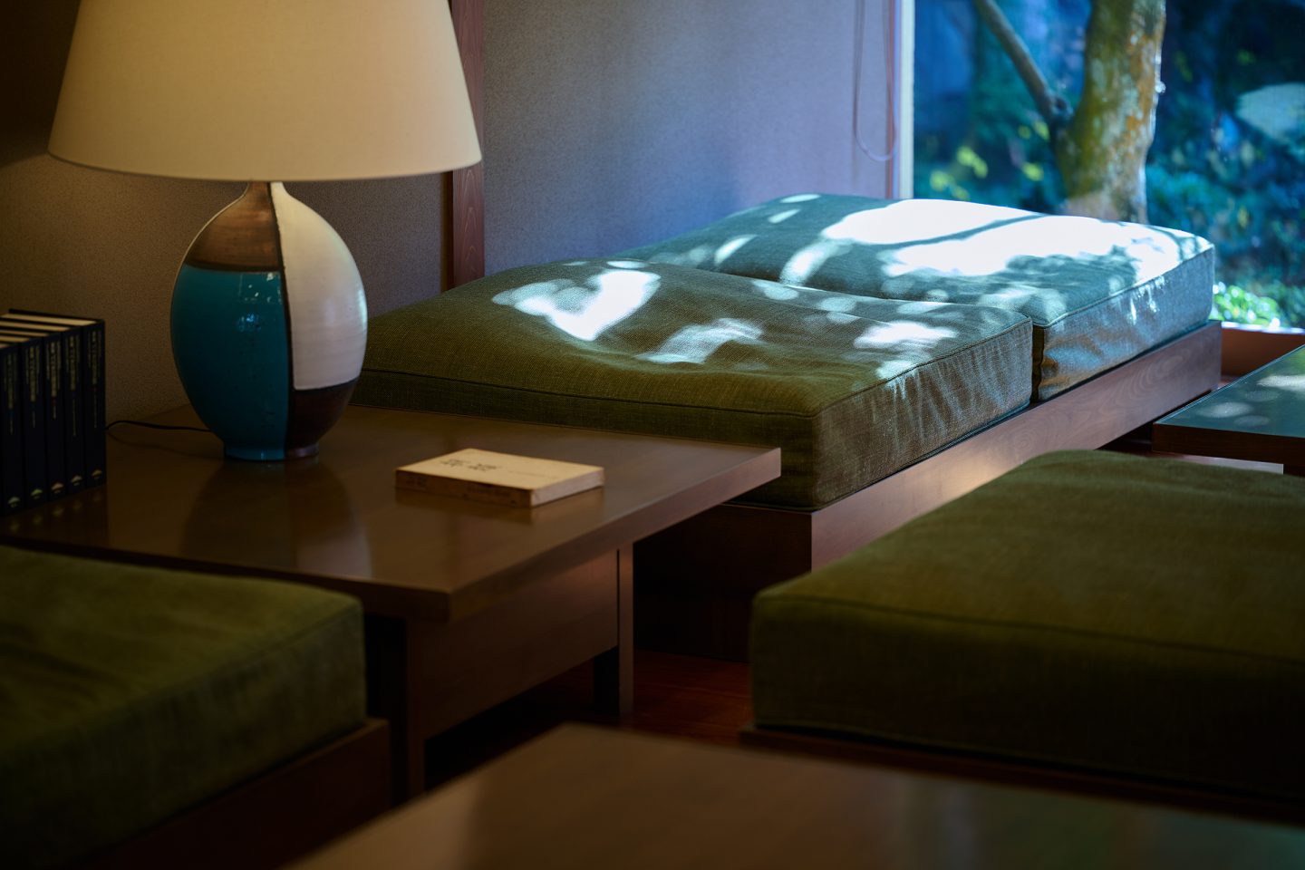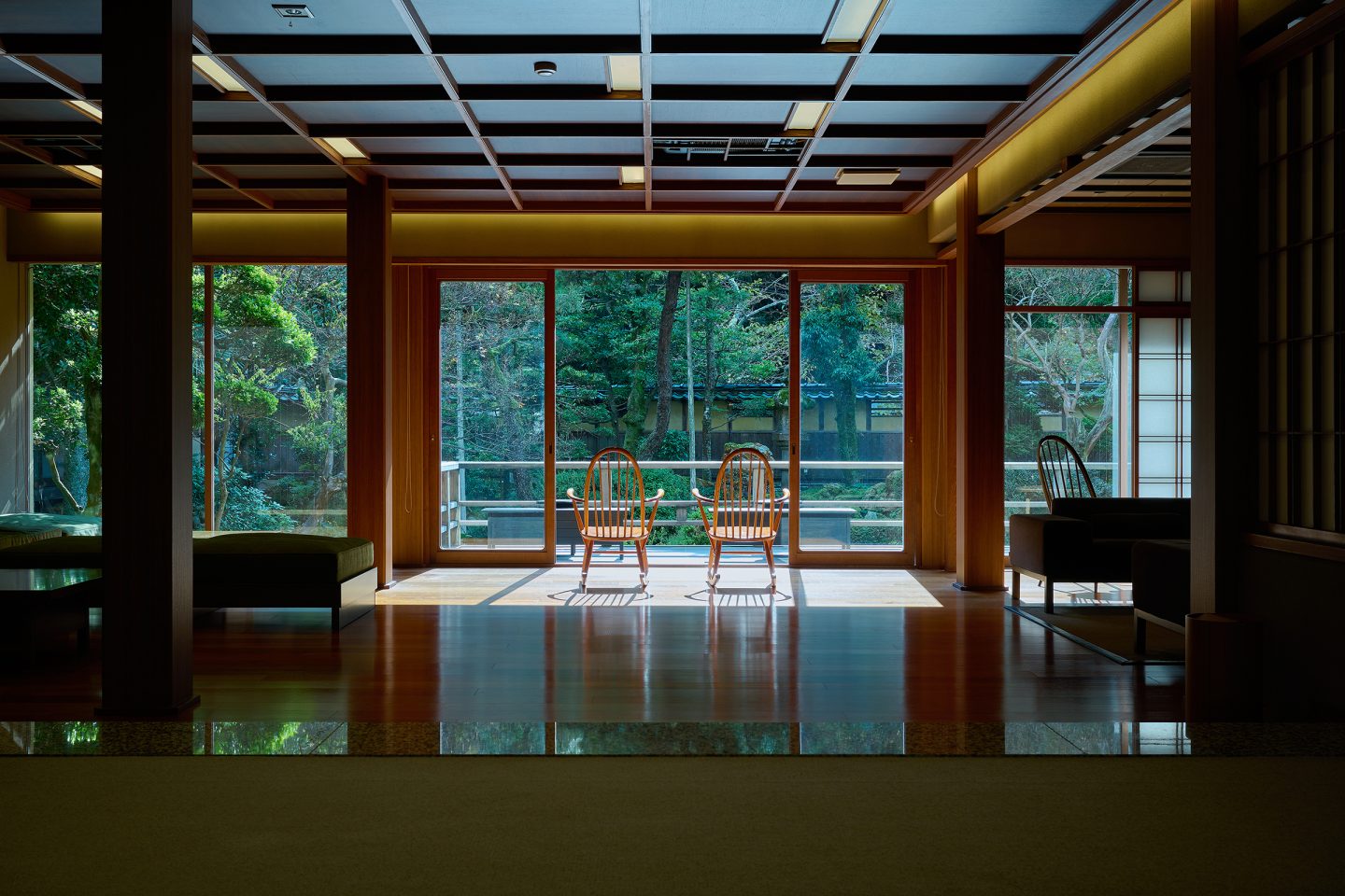玄関を入ると広がるロビーは、開放的で自然光が溢れる心地よい空間です。正面に望む日本庭園は志賀直哉の小説「暗夜行路」に描かれたままの姿です。月見台に出てそよ風に吹かれるもよし、ロッキンチェアに揺られながらボーッとするもよし、併設のライブラリーで読書にふけるもよし。時間を忘れて思い思いの過ごし方をお楽しみください。