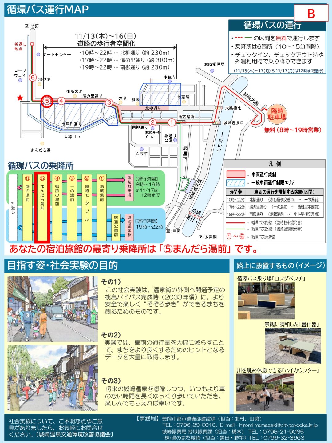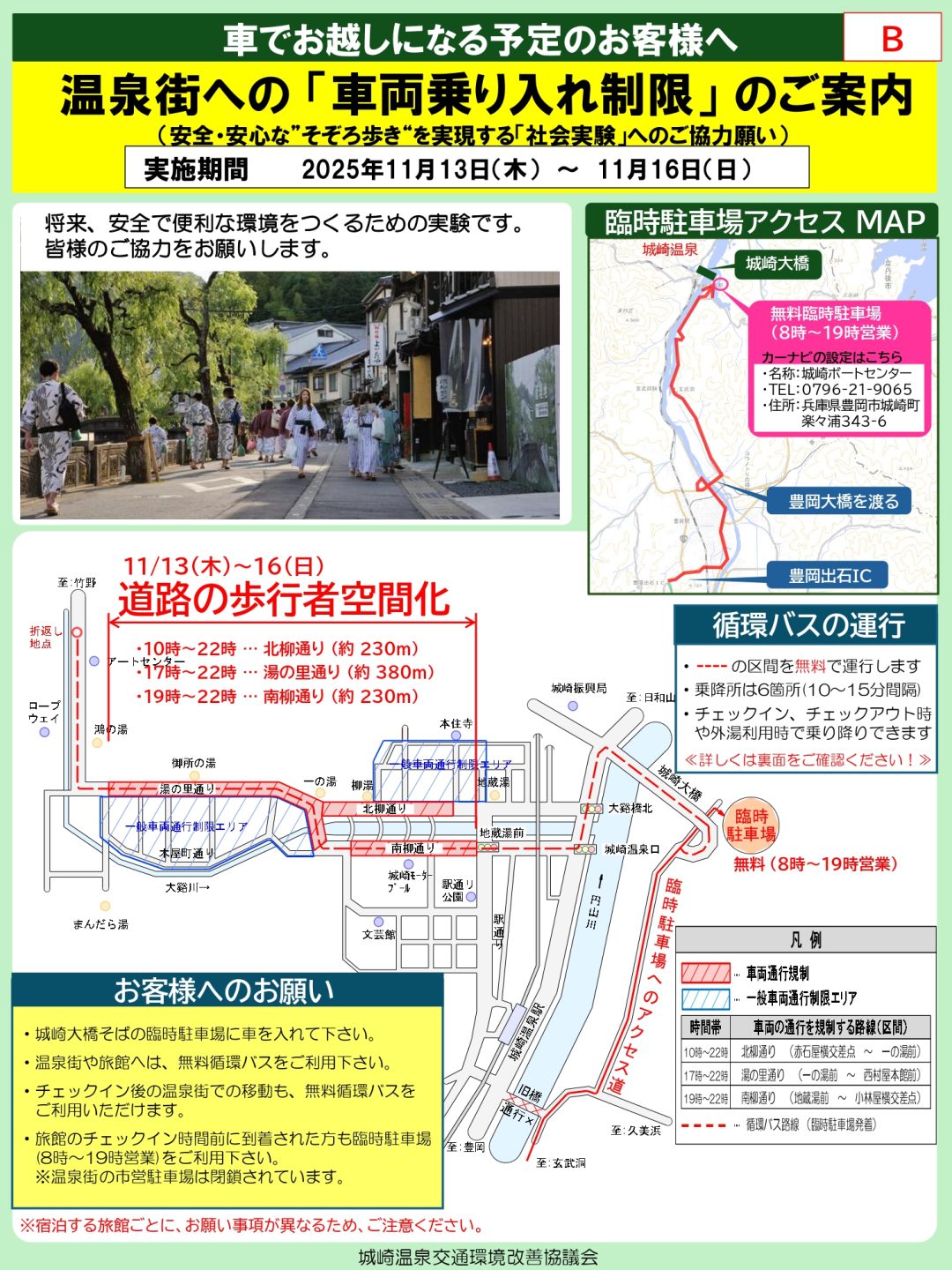 この度「安心・安全なそぞろ歩き」の実現を目指した城崎温泉交通環境改善計画の一環として、添付の通り社会実験を実施する旨の案内がありました。
