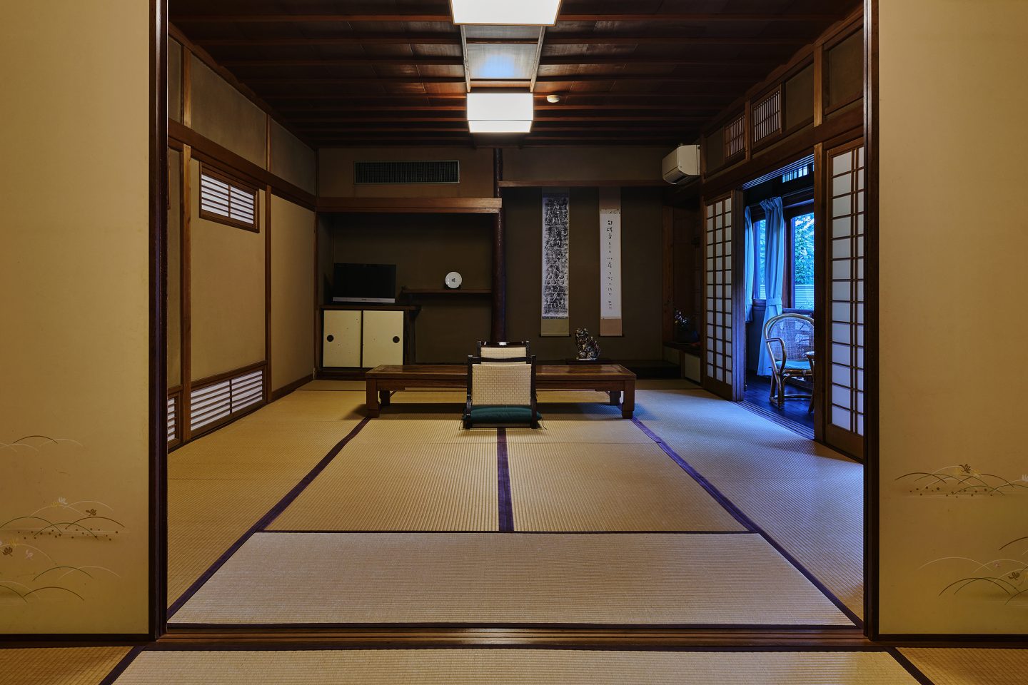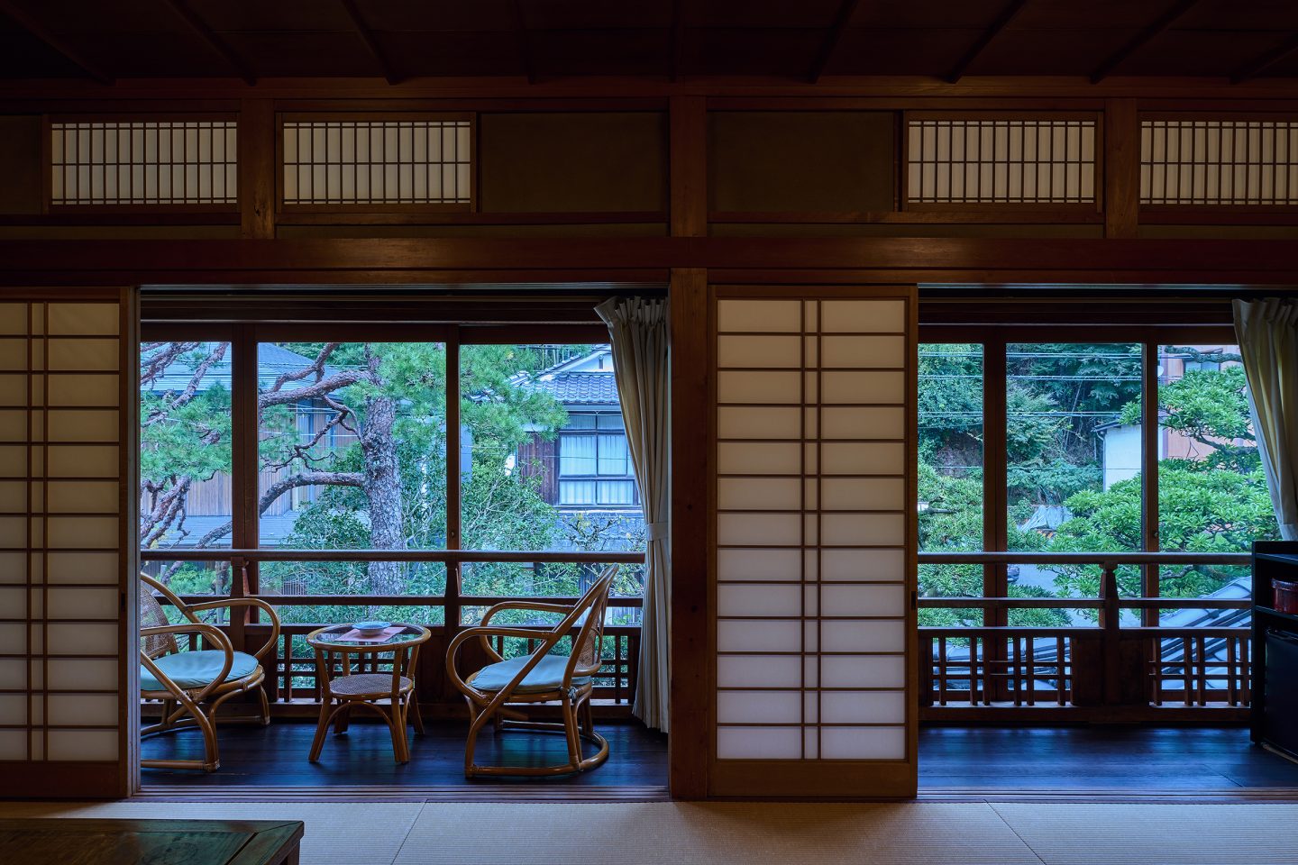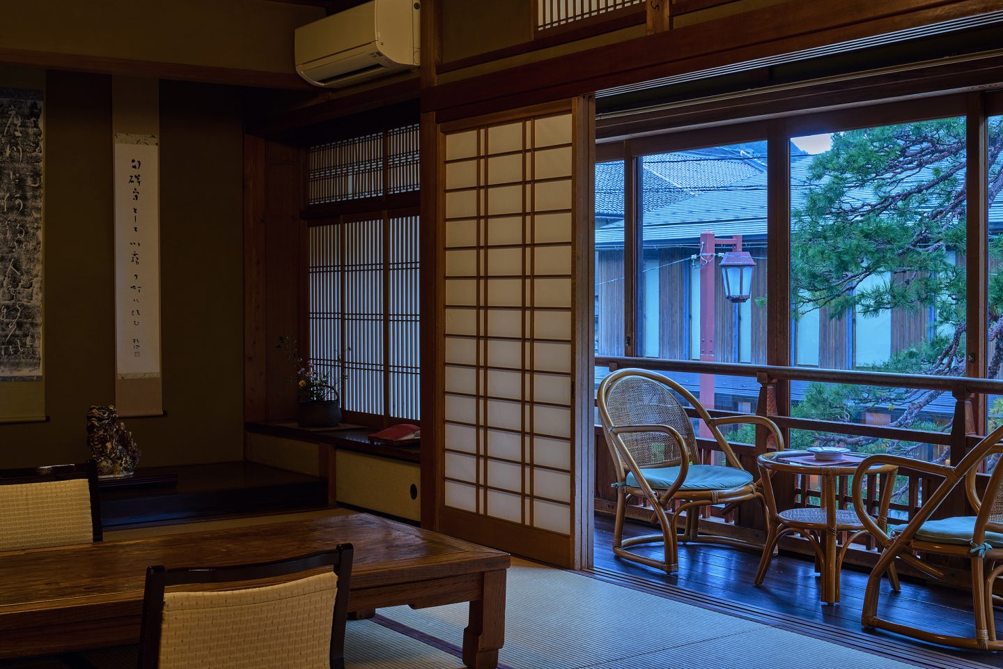 14畳+6畳の広々とした間取りで大人数でお泊りいただける客室です。重厚感のある書院造の客室で、木造りの温かみを感じていただけます。庭園には面していませんが、窓が広くとられ温泉街を眺めていただけます。こちらのお部屋は2階になります。